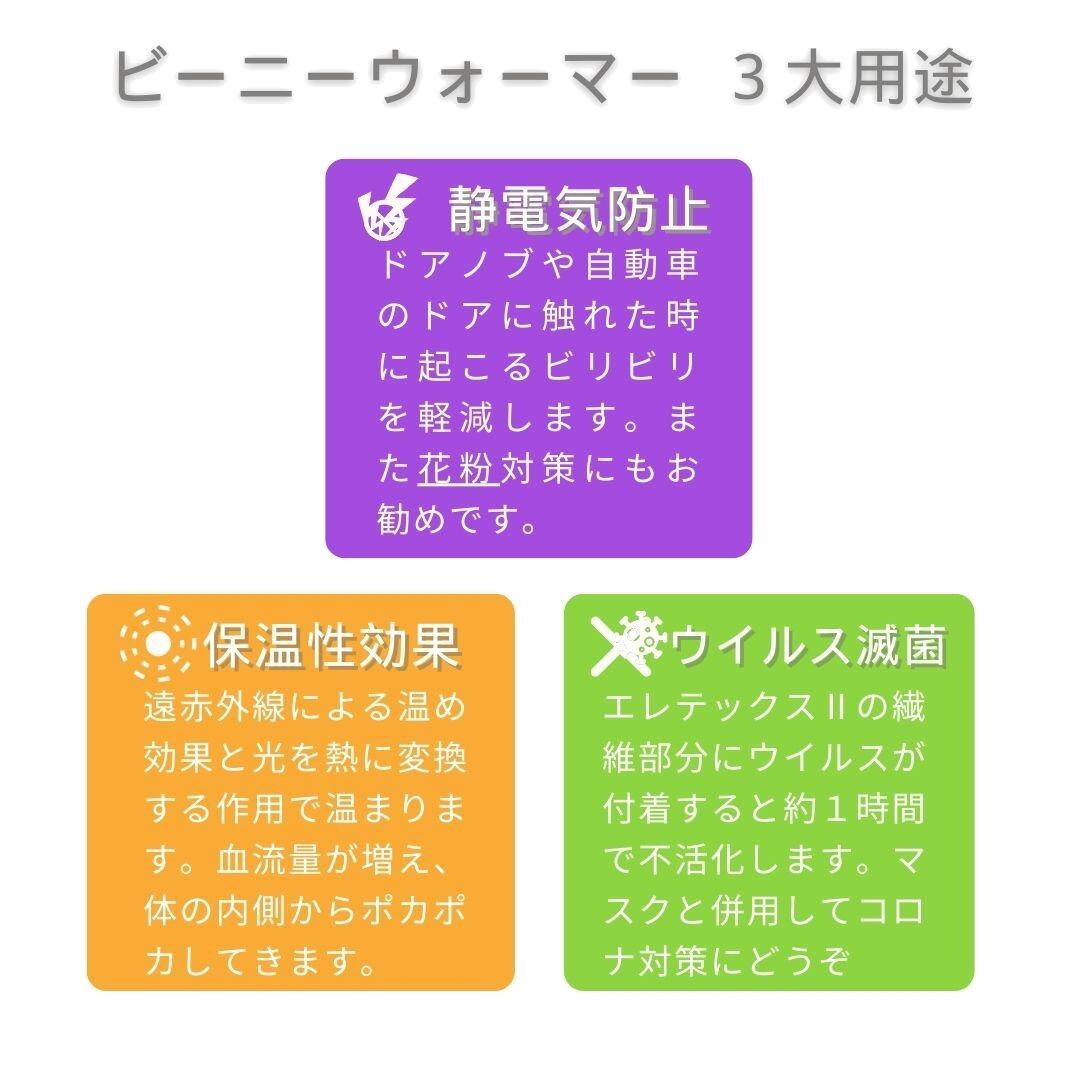 『除電ビーニーウォーマー』は、コットンと「アクリル導電繊維ソルファイバー」と「エレテックスⅡ」の3種類の糸を編んだ多機能アイテムで、アウトドアスポーツやトレッキングにオススメです。首元を温めるネックウォーマーとして、マスクの上から被せてフェイスカバーとして、はたまたニット帽のように使えば髪の艶がもどる3WAY商品です。